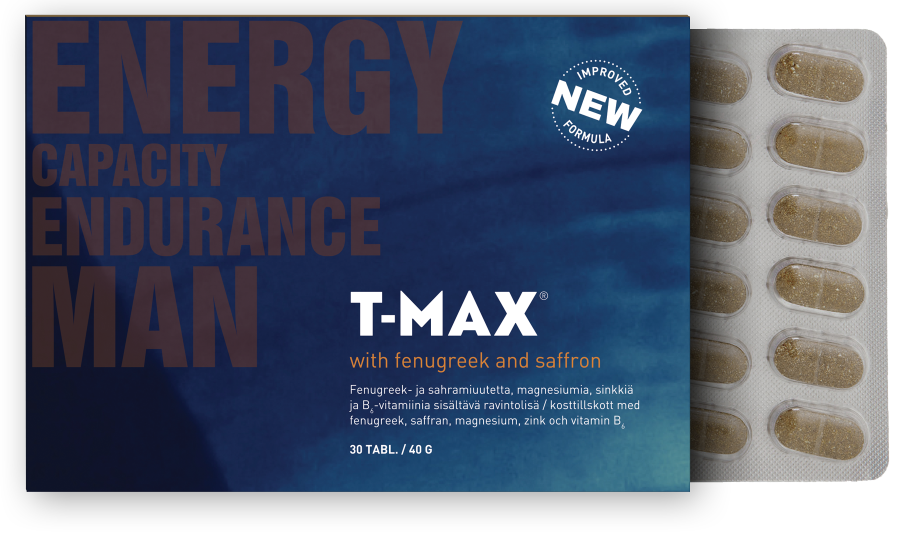 Erityisesti miehille suunniteltu T-Max® sisältää huolellisesti valittuja ainesosia, sinkkiä, magnesiumia, B6-vitamiinia, sarviapilan uutetta sekä uutuutena nyt myös sahramia. Sahramiuute tekee tuotteesta entistä monipuolisemman miehille, jotka haluavat ylläpitää elinvoimaa ja energiaa.