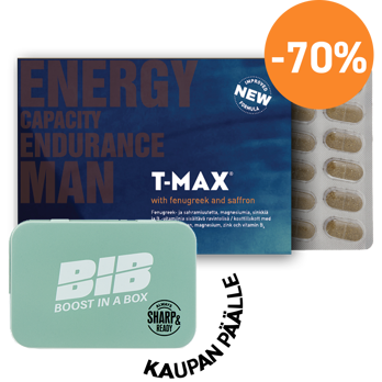 Kun tilaat T-Maxin nyt, saat lahjaksi Boost in a Boxin, joka on tiivistetyn jauheen muodossa oleva ravintolisä. Se edistää tarkkaavaisuutta, keskittymiskykyä ja vähentää väsymystä ja uupumusta päivän aikana.